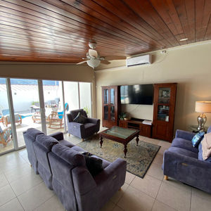 This breezy home is nicely tucked away in the mountain! It is quite spacious and has generous sized bedrooms and a lovely open concept living and dining space that opens out onto all the outdoor spaces. It's a great home for a group who want some peace between all the mayhem!!